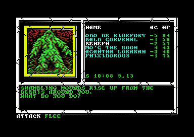 Cammogó halmok! Villant bajnokaim agyába a félelmetes felismerés. E növényi ellenfél igen veszélyes lehetett, mert a fegyverek alig sebezték, az ördöngös igék alig hatottak reá. Csapásától pedig ezernyi kis ágacska csavarodott az ember lábára, hogy mozdulni sem bírt.Embereim úgy ítélték meg, hogy efféle ellenfél még túl nagy falat lenne számukra, ezért elfutottak (Flee).